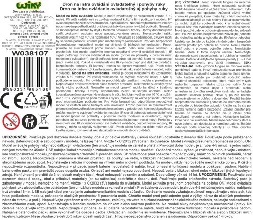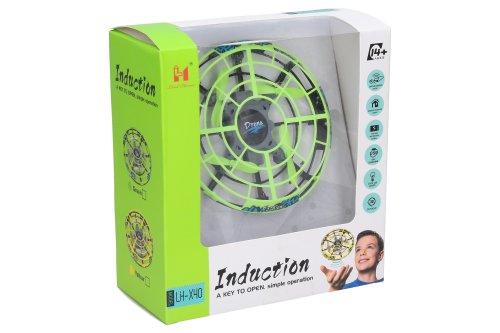 Dron indukční RC ovládáním ruky. Rozměry 12x3,5 cm. Ovládání přiložením ruky. Hození dronu - počátek letu, ruka pod dronem - pohyb nahoru, ruka před boční stranou - pohyb do strany. Ovladač jen pro vzlétnutí a přistání. 3.7V 300mAh bateriový pack vestavěný v dronu. USB kabel součástí. Přepínač ON/OFF na spodní straně dronu. Dálkový ovladač s jedním tlačítkem ON/OFF.