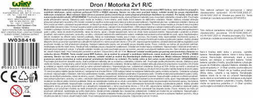 Dron motorka 2v1 RC na dálkové ovládání. Transformace z dronu do motorky. Ovládání pouze ovladačem, bez senzorového ovladače na ruku, bez WIFY a kamery. Rozměry 17x15x7 cm. Světelné efekty. 3.7V bateriový pack součástí, 2xAA do ovladače nejsou součástí. USB kabel součástí. Funkce - stání na jednom místě, nouzové přistání, tlačítkový vzlet a přistání, vrácení do výchozí pozice, obrat o 360 stupňů, nastavení pomalé a vysoké rychlosti. Tlačítkem na ovladači přepnutí ovládacího módu z dronu na motorku. Kola motorky zvlášť přiloženy v balení. Tlačítko ON/OFF na dronu a na ovladači.