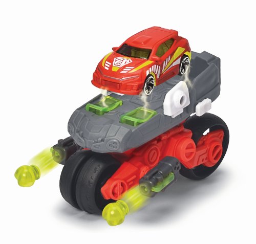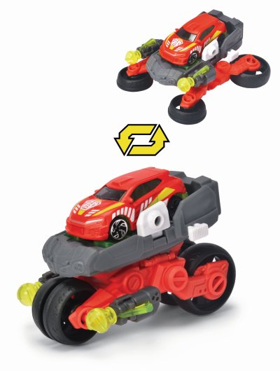Skládací transformer vozidlo 2 v 1 - motocykl a dron je hlídkou na zemi i ve vzduchu a zajišťuje bezpečnost ve městě. Jediným pohybem se bleskově rychlý motocykl promění v drona. Včetně kovového autíčka (7,5 cm) na palubě, které lze připevnit a sejmout pomocí klipsu. Auto lze ručně přeměnit na robota. Aby se hybridní vozidlo ubránilo blížícím se útočníkům, má 2 střelná ramena, která lze ovládat ručně, ať už na zemi nebo ve vzduchu. Zařízení do auta a střely jsou kompatibilní s jinými vozidly nebo upínacími bloky. V měřítku 1:64. Výška 12 cm.