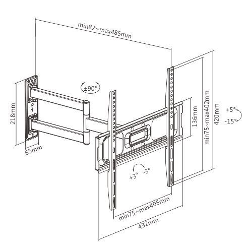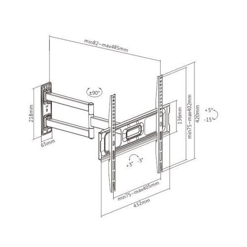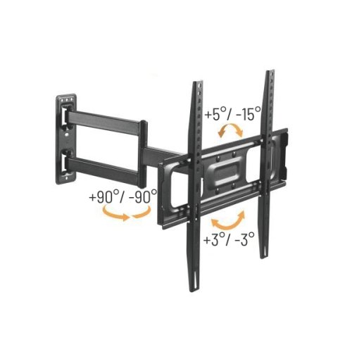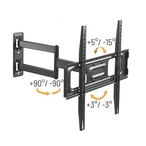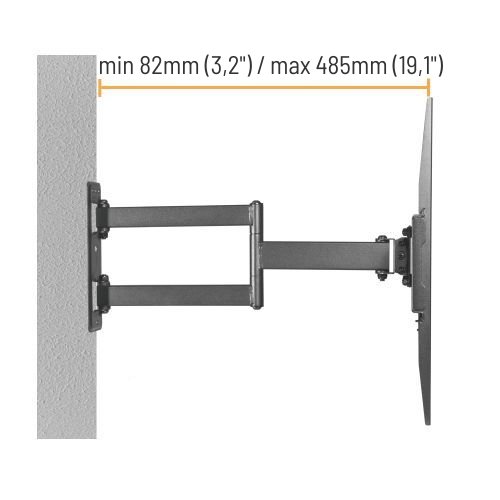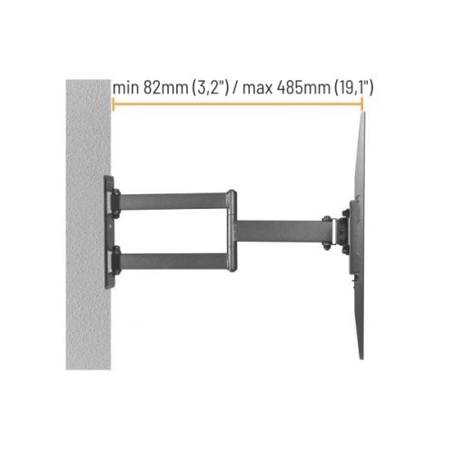 Držák je určený pro jeden plochý televizor s úhlopříčkou od 32" do 55". Odolné ocelové rameno unese hmotnost až 35 kg. Výsuvné rameno vám umožní nastavení vzdálenosti od 82 do 485 mm, naklopení nahoru a dolů, rotaci nebo natočení do stran. Obrazovku tak můžete sledovat z různých míst.