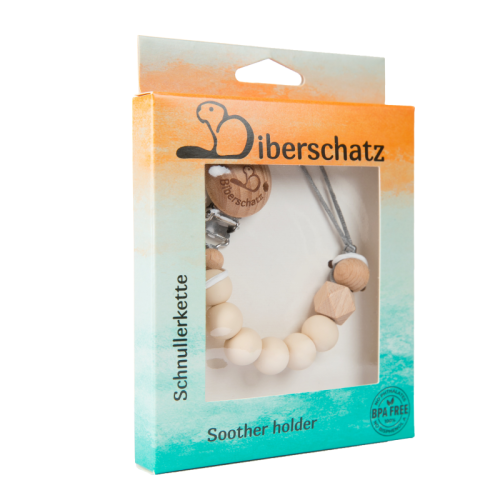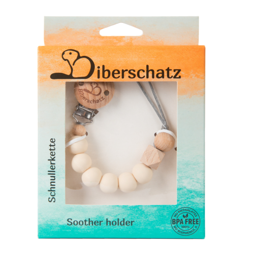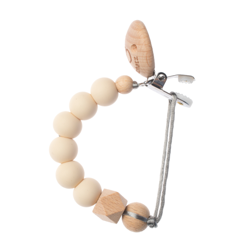 vyroben ze 100% hypoalergenního silikonu, bukového dřeva, saténové šňůrky a kovového klipu