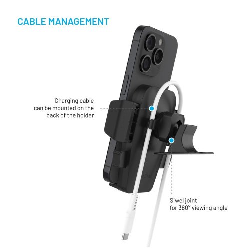 Aby váš mobilní telefon zůstal bezpečně na místě, je jeho stabilita zajištěná zkosenými opěrkami na spodní straně držáku. Ty vám ani nebrání v přístupu ke konektoru. Mobil si nabijete i na cestě do práce, za příbuznými nebo přáteli. Pomocí 360° otočného kloubu si nastavíte ideální pozorovací úhel. Vždy tedy dobře vidíte na obrazovku telefonu. Odnímatelné úchyty na zadní straně držáku vám umožní lepší organizaci kabelů.