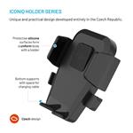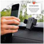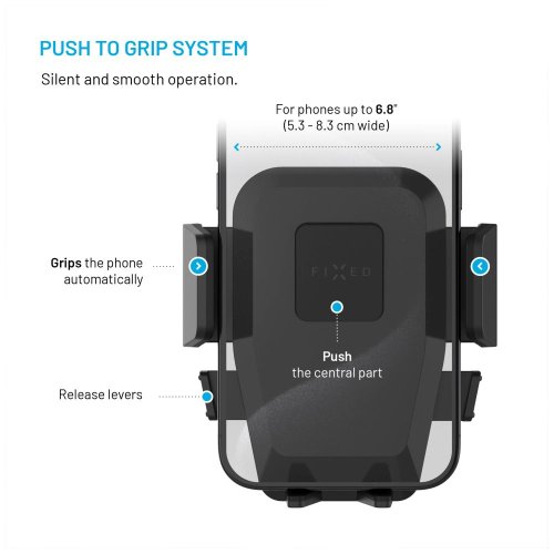 Držák je kompatibilní s telefony o šířce 5,3 až 8,3 cm. Díky rychloupínacímu systému Push and grip uchytíte telefon do držáku jednou rukou. Jen mobil lehce přitisknete na plochu držáku. Boční kleště se samy přizpůsobí vašemu telefonu. Jediným stiskem ho zase uvolníte. Mechanismus je tichý a plynulý.
