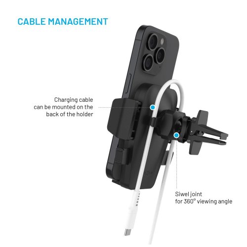 Aby váš mobilní telefon zůstal bezpečně na místě, je jeho stabilita zajištěná zkosenými opěrkami na spodní straně držáku. Ty vám ani nebrání v přístupu ke konektoru. Mobil si nabijete i na cestě do práce, za příbuznými nebo přáteli. Pomocí 360° otočného kloubu si nastavíte ideální pozorovací úhel. Vždy tedy dobře vidíte na obrazovku telefonu. Odnímatelné úchyty na zadní straně držáku vám umožní lepší organizaci kabelů.