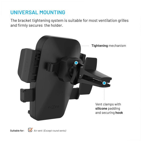 Zajistěte si skvělý výhled na obrazovku svého mobilního telefonu, i když jedete na dovolenou nebo na služební cestu. Univerzální držák do auta FIXED Iconiq Vent upevníte pomocí kleští se zpětným háčkem za lamelu ventilace ve vašem voze. Háček brání ve vypadnutí držáku.