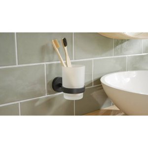 tesa® Moon Černý držák kelímku na zubní kartáčky praktický a dekorativní doplněk: sklenice v saténovém provedení s držákem v elegantní matné černé barvě povrch je voděodolný, zaručeně nerezavějící a …