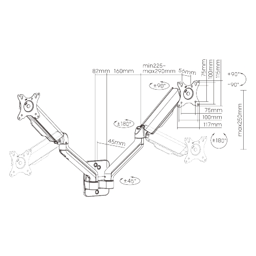 Díky odolné ocelové konstrukci poskytuje stabilní podporu pro dva monitory s úhlopříčkou 17" až 32" a hmotností až 9 kg na rameno. Flexibilní konstrukce pro dostatečné nastavení výšky a pozorovacích úhlů s možností nastavení orientace monitoru na výšku nebo na šířku.