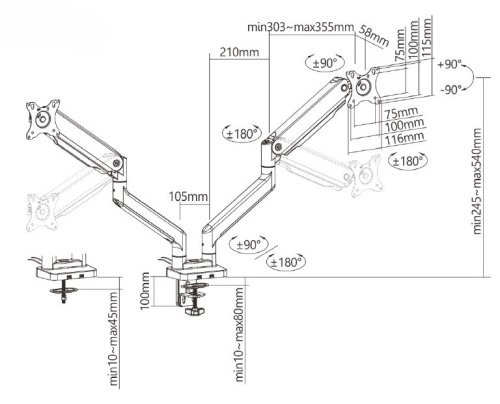 HLAVNÍ VLASTNOSTI: • Flexibilní nastavení polohy: Držák umožňuje snadné nastavení výšky, nastavitelný náklon monitoru v úhlu +/- 90°, vychýlení do stran o 180° a otočení monitoru o 360°, takže můžete snadno najít optimální pozici pro pohodlné a ergonomické používání. Odnímatelná deska VESA umožňuje snadnou instalaci monitoru. • Vestavěný pružinový mechanismus umožňující dokonalé nastavení tuhosti ramen dle hmotnosti monitoru zajišťuje snadný pohyb nahoru a dolů. • Univerzální kompatibilita: Tento stolní držák je kompatibilní s většinou monitorů o velikosti od 17" do 35" palců a s VESA standardy 75x75mm a 100x100mm. Nezáleží na tom, zda používáte LCD, LED nebo OLED monitor, držák monitoru Brateck poskytne bezpečné a stabilní uchycení. • Vestavěný systém průchodek pro usnadnění organizace vedení kabelů. • Odolná konstrukce: Držák je vyroben z vysoce kvalitního materiálu, který zajišťuje stabilitu a odolnost. • Snadná instalace: Držák je dodáván s kompletním montážním příslušenstvím, díky němuž je možné ho snadno namontovat na stůl během několika minut. Snadná montáž pomocí svorky na desky o tloušťce 10-80 mm nebo pomocí průchodky na desky o tloušťce 10-40 mm.