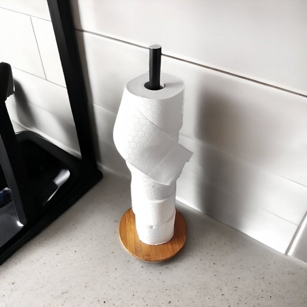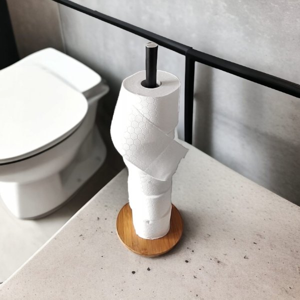 Dodejte své koupelně elegantní a moderní vzhled s designovým držákem na toaletní papír v kombinaci černého kovu a přírodního dřeva. Tento minimalistický a funkční doplněk perfektně zapadne do moderních i industriálních interiérů. Robustní konstrukce držáku zajistí dlouhou životnost, zatímco kapacita až pro 6 rolí toaletního papíru vám ušetří starosti s neustálým doplňováním