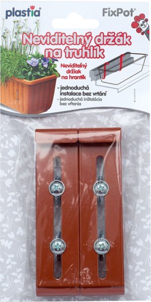 Neviditelný držák na truhlík k uchycení na parapet bez vrtání do fasády. Zabraňuje spadnutí truhlíku následkem vyšší váhy truhlíku nebo špatných klimatických podmínek. Je vhodný do většiny plastových oken. Je určen pro truhlíky s výškou 10 - 19 cm a délkou méně než 60 cm. Pro truhlíky delší než 60 cm je vhodné přidat další držák.