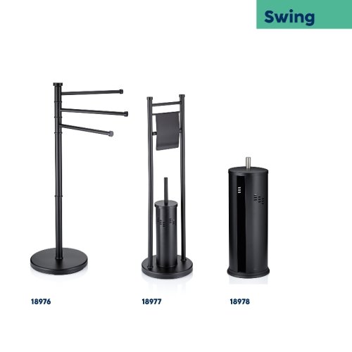 Zásobník na toaletní papír ze série SWING je vyroben z nerezové broušené nerezové oceli matného vzhledu a zdobený vzorem po celém obvodu otvorů. V zásobníku lze uložit až tři role toaletního papíru. Díky bočnímu otevírání nádoby lze každou roli snadno vyjmout nebo znovu naplnit. Nádoba na toaletní papír má víko, které ji chrání před nečistotami a vlhkostí. Gumový povlak na dně dodává nádobě potřebnou stabilitu a také ji chrání před poškrábáním.