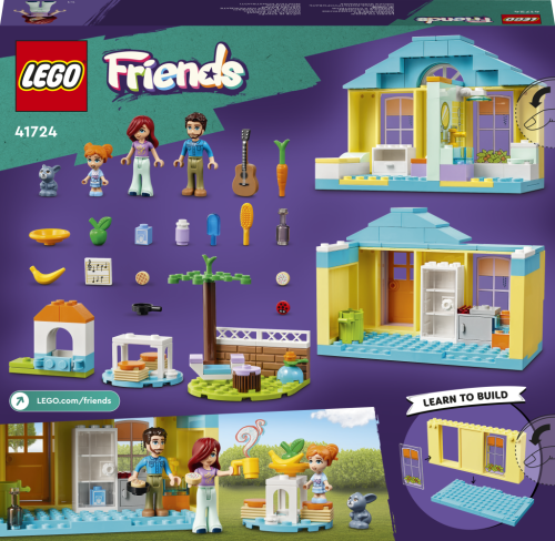 V domu Paisley od LEGO® Friends (41724) budou mít mladí stavitelé od 4 let stále co prozkoumávat. V horním patře je ložnice a koupelna, ale lze jej sundat, aby bylo snazší hrát si i v kuchyni dole. Nechybí spousta doplňků pro hraní příběhů, včetně dobrůtek a ovoce, venkovního stolu a koše na třídění odpadků. V zahradě má Paisley útulný koutek, kde hrává na kytaru a píše písničky. Společnost jí dělá králíček, pro kterého má nachystanou mrkvičku.