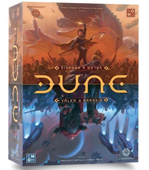 Epická bitva o Arrakis. Svět spočívá na čtyřech základech... Na učení moudrých, spravedlnosti velkých, víře pravdivých a odvaze statečných. Ale každý z nich je k ničemu... když neexistuje vládce, který ovládá umění vládnout. Duna: Válka o Arrakis je tematická strategická desková hra zaměřená na události Pouštní války v oceňované knize Duna od Franka Herberta. Prohnaný rod Harkonnenů, podporovaný imperiálním rodem Corrinů, musí bojovat se zbytky rodu Atreidů, kteří se spojili s domorodými fremeny, o kontrolu nad Arrakisem a jeho nejcennějším zdrojem: kořením zvaným melanž. V této asymetrické hře musí rod Harkonnenů se svými vojáky ovládnout Arrakis, protože kdyby koření přestalo proudit, ztratili by podporu mocností uvnitř Impéria. Mezitím Paul Muad‘Dib, mladý atreidský vůdce a mesiáš, musí vést fremenské vzbouřence a skrze své jasnozřivé vize najít cestu k osudu Arrakisu, nevyhnutelnému džihádu a budoucnosti, kde se stane Kwisatz Haderachem. Zatímco Harkonnenové se spoléhají na svou techniku jako ornitoptéry a karyoly, Atreidové si podmanili sílu pouště a do bitvy jezdí na obrovských písečných červech. Každá frakce používá odlišnou strategii postavenou na unikátních velitelích a sadě plánovacích karet, aby dosáhla svých vlastních podmínek vítězství. Válka o Arrakis začíná... teď. Doporučený věk: 14+ Počet hráčů: 1-4 Obsah balení: 129 figurek 9 plastových podstavců 24 kostek 2 mapové desky 7 desek 125 karet 86 žetonů 1 kniha pravidel