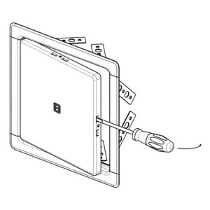 • INSTALACE: Rámeček dvířek je vybaven děrovanými montážními pásky, za které je po jejich ohnutí možno instalovat do stavebního otvoru pomocí vrutů, tmelů, sádry apod. Dvířka se uzavírají lehkým zatlačením do rámečku, otevírají se pomocí plochého šroubováku, kterým zapáčíme po vložení do mezery mezi dvířky a rámečkem v místě kteréhokoliv zářezu v boku dvířek.