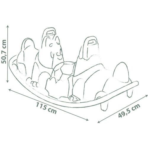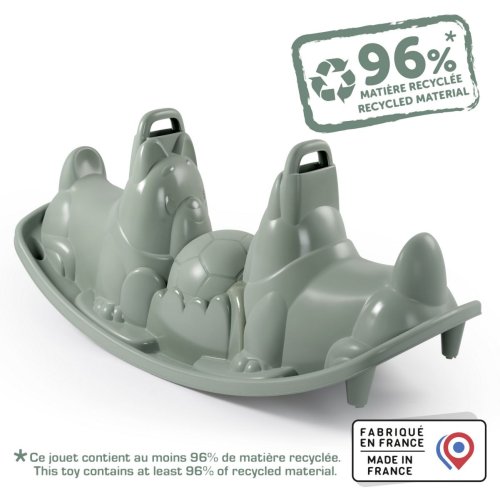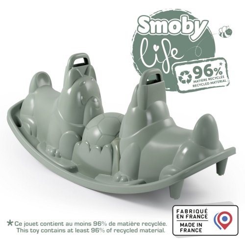 Dvojitá houpačka s ergonomickými sedátky ve tvaru pejska v zelenošedé barvě. Dvě držátka pro bezpečné použití. Plastové díly jsou ošetřeny anti-UV, což zajišťuje dobrou odolnost a stálost barev v průběhu času. Tento výrobek obsahuje minimálně 96% recyklovaného materiálu.