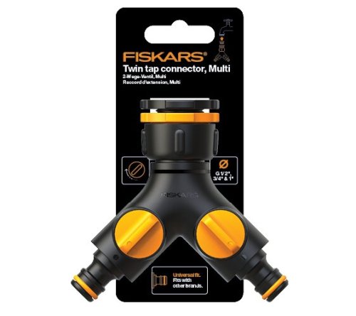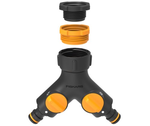 Spojka s vnitřním závitem, kterou lze snadno našroubovat na zahradní kohoutek o průměru O 21 mm (1/2") / O 26,5 mm (3/4") / O 33,3 mm (1"), následně k ní lze připojit hned dvě zahradní hadice. Dva samostatné ventily umožnují nezávisle regulovat průtok vody v každé hadici. Barva: černo-oranžová. Výška: 11,8 cm, délka: 15,8 cm, šířka: 4,5 cm. Hmotnost: 85 g.