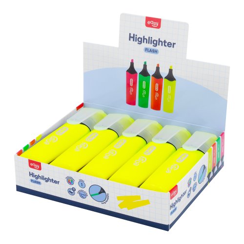 Plochý tvar a ideální tloušťka zvýrazňovače EASY FLASH zaručují pohodlné držení. Víčko zabraňuje vysychání náplně a chrání před znečištěním. A díky klipu na víčku můžete zvýrazňovač jednoduše připevnit k sešitu nebo knize.