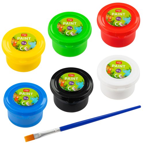 v sadě: 6 kelímků s plakátovými barvami, štětec