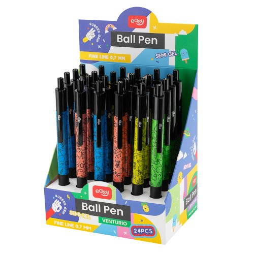 V sérii propisek EASY VENTURIO se nachází speciální náplň se semi-gelovou konzistencí v klasické, modré barvě. Tato náplň zajišťuje pohodlné vedení kuličkového pera po papíru při uchování parametrů běžné náplně. Pevná koncovka umožňuje provádění tenkých, přesných čar.