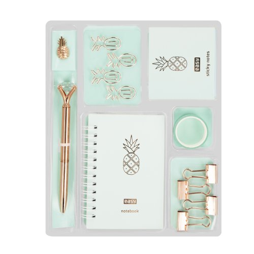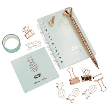 Tato elegantní sada v sobě spojuje funkčnost, styl a špetku tropické atmosféry. Obsahuje vše, co potřebujete pro každodenní psaní, plánování a organizaci, a navíc s roztomilými detaily ananasu, které vám vykouzlí úsměv na tváři.