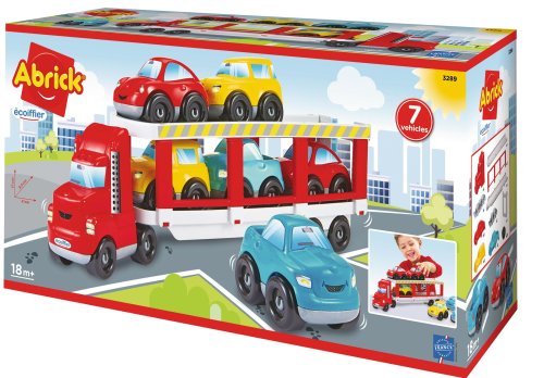 Transportér z řady Abrick pro přepravu 6 osobních aut má sklopnou rampu, přes kterou lze auta nakládat a vykládat. Včetně šesti barevných autíček. Rozměry (DxŠxV): 41 x 8,5 x 17 cm.