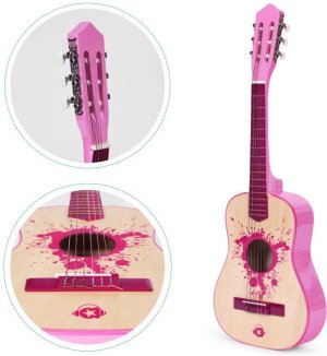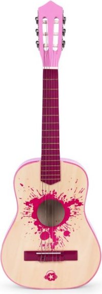 Nauč se hrát na kytaru! Dětská kytara pro děvčata byla navržena tak, aby měla všechny vlastnosti profesionálního nástroje. Má kobylku a hmatník se šesti strunami (3 kovové, 3 nylonové). Krk má 18 pražců a je zakončen hlavou s ladící mechanikou. Délka kytary: 76 cm Poznámka: Kytara je dodávána v nenaladěném stavu s povolenými strunami.