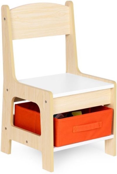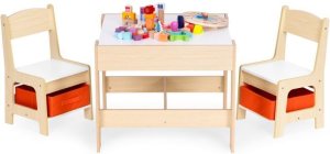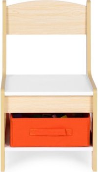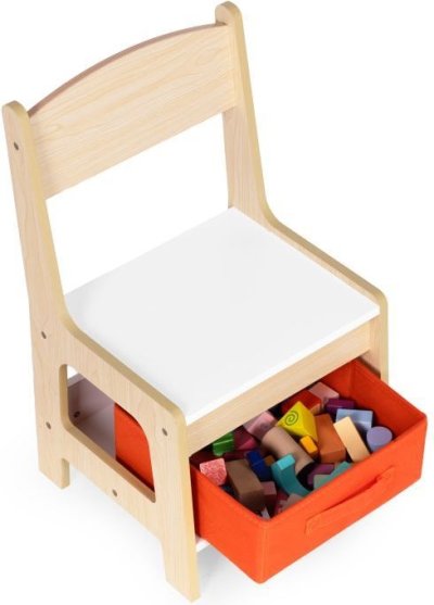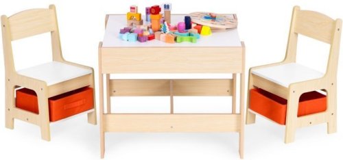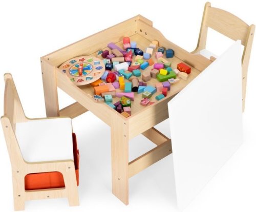 stabilní dřevěná konstrukce je doplněna o MDF desku, která se snadno udržuje, dvě stabilní a pohodlné židle, stůl má odnímatelnou horní část a lze jej použít i jako tabuli, pod deskou stolu jsou funkční přihrádky pro uložení kostek, hraček nebo jiných drobností, v prostoru pod deskou stolu je i role papíru, na kterou může dítě kreslit nebo malovat, pod sedákem židlí jsou prostorné textilní zásuvky, ideální pro uložení hraček, jednoduchý design ve skandinávském stylu.