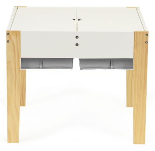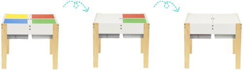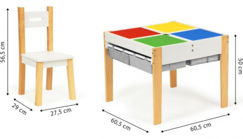 masivní borové nohy dvoudílná odnímatelná deska stolu s deskami pro umístění lega 4 výsuvné přihrádky ve středu stolu ideální pro dětský pokoj nebo hernu jednoduchý design ve skandinávském stylu rozměry herního stolu: 60,5 x 60,5 x 50 cm rozměry židličky: 56,5 x 29 x 27,5 cm
