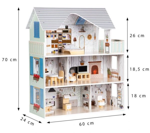 Pro děti od 3 let. Rozměry domečku: 70 x 60 x 24 cm. Dřevěná, bezpečná konstrukce. Rozvíjí představivost, kreativitu a manuální dovednosti.
