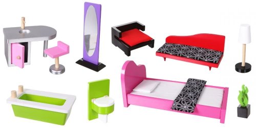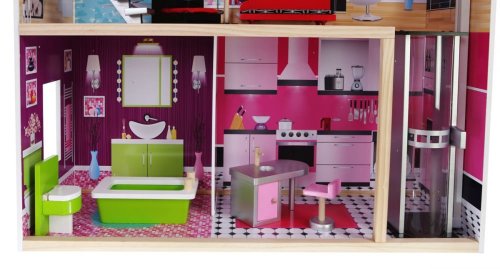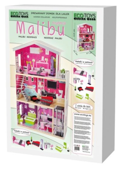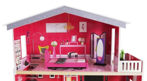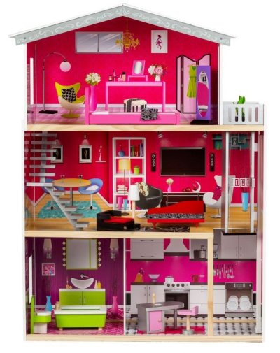 Dřevěný domeček pro panenky se třemi patry a celkem 4 různými pokoji a malým balkonem. V přízemí je koupelna a kuchyně. V prvním patře najdete prostorný obývací pokoj a ve druhém poschodí pak krásnou ložnici s balkónem. Z prvního patra do druhého se dostanete výtahem a z druhého patra do třetího vede moderní schodiště. Rozměry domečku: 82,5 x 32 x 115 cm. Balení obsahuje: domeček, 10 dílů nábytku a příslušenství. Upozornění: Výrobek je dodáván v demontovaném stavu. Při sestavování postupujte dle přiloženého obrázkového návodu. Montáž smí provádět pouze dospělá osoba. K montáži je třeba šroubovák (není součástí balení).