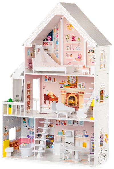 Dřevěný domeček pro panenky se třemi patry a celkem 5 různými pokoji. V přízemí je koupelna a kuchyně. V prvním patře najdete prostorný obývací pokoj s balkonem a ve druhém poschodí pak krásnou ložnici s nebesy. Z přízemí do prvního patra vede elegantní schodiště. Rozměry domečku: 82 x 30 x 126,5 cm. Balení obsahuje: díly pro sestavení domečku, 15 dílů nábytku a příslušenství. Upozornění: Výrobek je dodáván v demontovaném stavu. Při sestavování postupujte dle přiloženého obrázkového návodu. Montáž smí provádět pouze dospělá osoba. K montáži je třeba šroubovák (není součástí balení).
