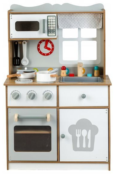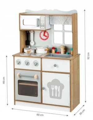 Dětská útulná kuchyňka od značky ECOTOYS je vhodná pro každého malého kuchaře nebo kuchařku! Kuchyňka je vyrobena z kvalitního dřeva. Součástí kuchyňky je sporák s 4 plotýnkami, trouba, mikrovlnná trouba, dřez s kohoutky odlišné podle barvy, úložný a odkládací prostor. Děti se mohou při vaření dívat z okna se záclonkou, které je součástí kuchyňky. Na stěně kuchyňky visí hodiny. Obsahuje doplňky jako je hrnec, pánev s pokličkou, příbory, 2 talíře, naběračka, obracečka, dózičky na pepř a sůl . Rozměry kuchyňky: 60 x 30 x 93,5 cm. Upozornění: Výrobek je dodáván v demontovaném stavu. Při sestavování postupujte dle přiloženého obrázkového návodu. Montáž smí provádět pouze dospělá osoba. K montáži je třeba šroubovák (není součástí balení).