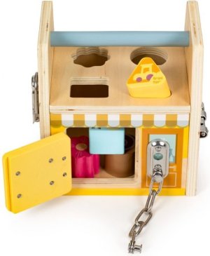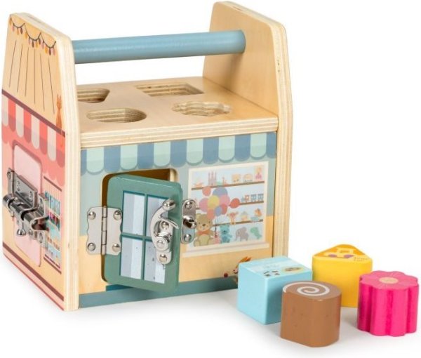 pevná a bezpečná dřevěná konstrukce stěny kostky jsou vybaveny různými zámky, díky kterým mohou děti rozvíjet své poznávací a motorické dovednosti v horní části kostky se nachází třídička kostek, která dítě naučí rozpoznávat barvy a tvary rukojeť umožňuje snadné přenášení rozměry: 15,5 x 17 cm