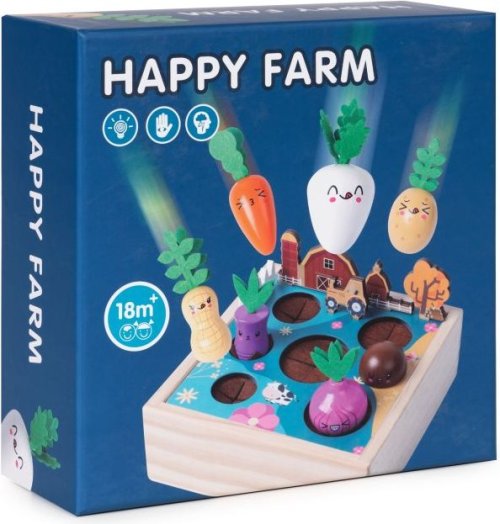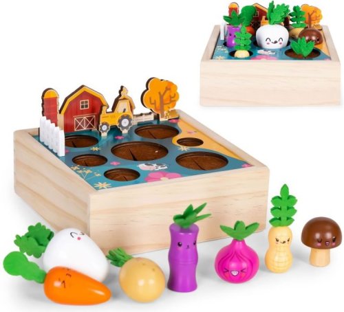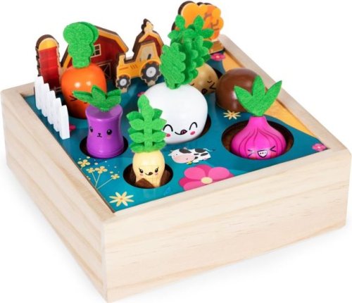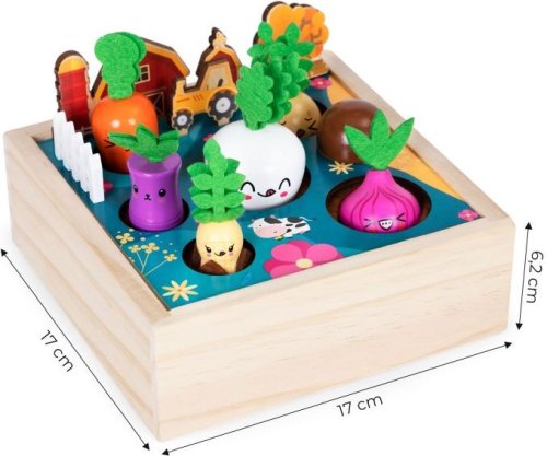 bezpečné dřevěné provedení, otevírací víko pro snadné skladování, součástí víka je panorama farmy, podpora manuální dovednosti a znalosti o zelenině.