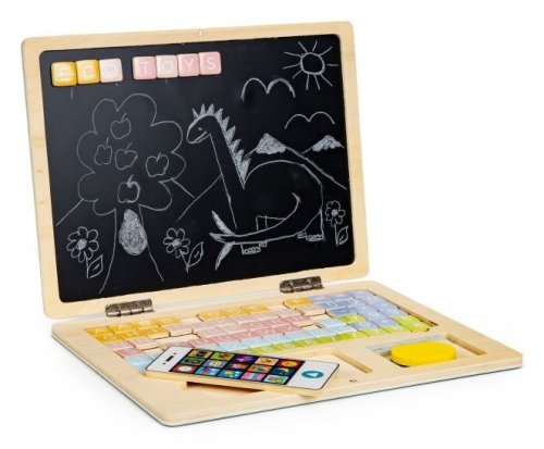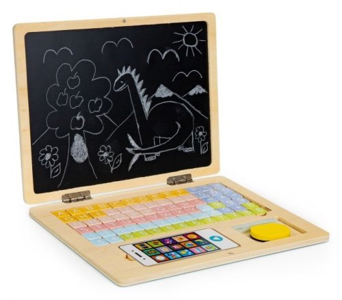 Dřevěná hračka, která se bude líbit a zároveň bude působit příznivě na rozvoj dítěte. Laptop má namísto monitoru magnetickou tabuli, na kterou mohou děti psát a kreslit křídou. Klávesnici tvoří magnetická písmenka, číslice a znaky se kterými jdou skládat slova a početní příklady nejen na monitor notebooku. Hračka seznamuje děti zábavnou formou s písmeny a číslicemi. Balení obsahuje : notebook, 78 magnetických dílků, 2ks bílé křídy, houbičku a maketu chytrého telefonu Rozměry notebooku: 30 x 22 x 22 cm Rozměr magnetické tabulky: 30 x 22 cm Vhodné pro děti od 3 let.
