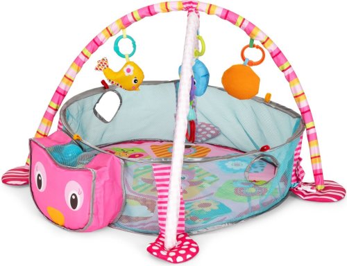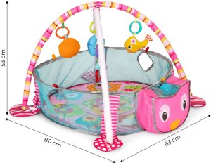 Vyrobena z bezpečných materiálů, různé textury, tvary a barvy přitahují pozornost a podporují rozvoj malého dítěte, rozvoj představivosti, motorických a manuálních dovedností, měkká, barevná konstrukce se zavěšenými hračkami (5 ks), 30 barevných míčků v sadě, úložný prostor na míčky v hlavě zvířátka, rozkládací boční síťka plnící funkci ohrádky, 3 způsoby používání: bazén s míčky, podložka se zavěšenými hračkami bez boční stěny či ohrádka.