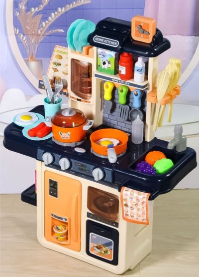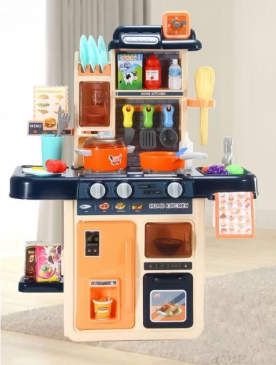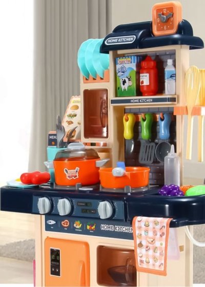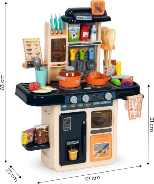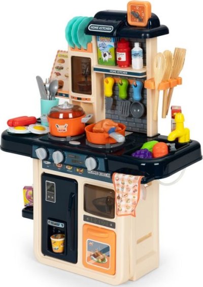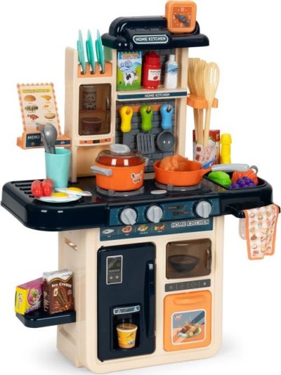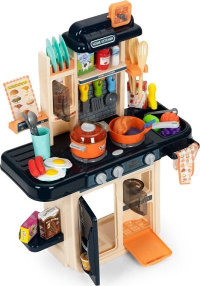 Zahrajeme si na kuchaře? Kuchyňka pro všechny malé kuchařky a kuchaře. Pozvěte si své kamarády a přichystejte jim nejrůznější dobrůtky. Po zapnutí hořáků vydávají kamna zvuk vařící vody a hořáky jsou navíc osvětleny červenými LED diodami. Skvělým doplňkem je vyvíječ páry - stačí naplnit jeden z hořáků vodou, položit na něj hrnec a po chvíli začne zpod pokličky vycházet pára. K dispozici je dřez, který lze naplnit vodou, jelikož z vodovodního kohoutku vytéká voda.