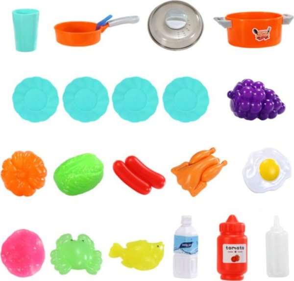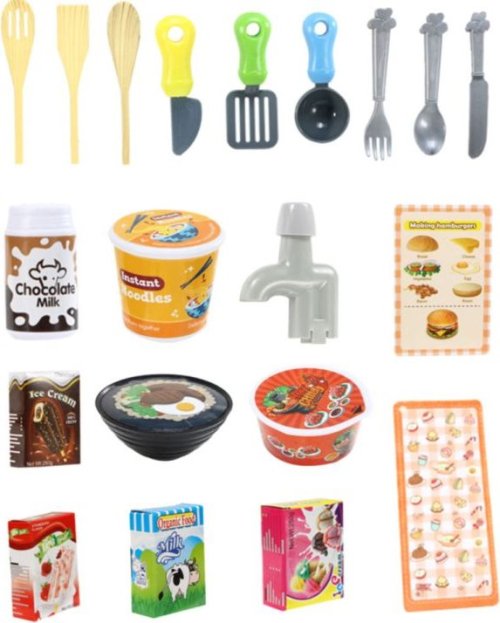 Sada obsahuje : příbory, talíře, pohárek, naběračka, obracečka, vařečky, hrnec s pokličkou, pánev, odměrka, láhev, mléko, kečup, polévky, ovoce a zelenina, kuře, ryba, krab, kotleta, vejce, krabice od zmrzliny, utěrka aj. Rozměry sestavené kuchyně: 63 x 31 x 47 x 23 cm Napájení : 3 ks baterie typu AA (nejsou součástí balení)