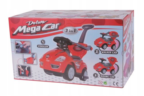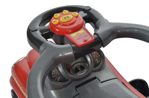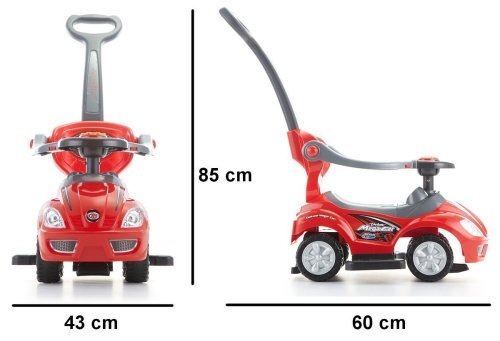 Červené autíčko s vodící tyčí pro děti, které již samostatně sedí. Odrážedlo je vybaveno vodící tyčí, díky které mohou rodiče své dítě vést. Tyč lze nastavit do dvou výškových poloh. Po stranách jsou odnímatelné zábrany, které usazené dítě jistí a zabraňují jeho vypadnutí. Vodící tyč i bezpečnostní zábrany lze dle potřeby odstranit. Auto má ve spodní části po stranách stupačky pro pohodlné umístění nohou dítěte. Pod sedadlem je úložný prostor, do kterého si dítě může uložit třeba svou oblíbenou hračku. Podvozek autíčka byl navržen tak, aby zabraňoval v nechtěném převrácení vozítka. Autíčko je vybaveno multifunkčním volantem. Na volantu je pět žlutých tlačítek. Po zmáčknutí tlačítka se ozve zvukový signál (auto přehrává čtyři melodie a klakson). Volantem lze otáčet, dle potřeby ho však lze zablokovat. Vozítko s vodící tyčí je určeno pro děti od 12 měsíců. Maximální nosnost je 25 kg. Rozměry odrážedla jsou 60 x 43 x 84 cm. Výška 84 cm je měřena až po konec vodící tyče. Pro provoz auta (zvukové efekty) jsou třeba baterie 2 x 1,5V AA baterie. Baterie nejsou součástí balení.