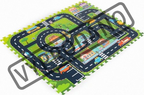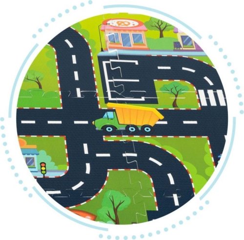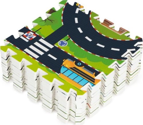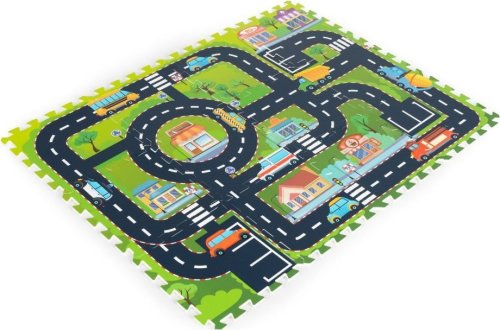 Pěnové puzzle s potiskem městečka s jeho ulicemi pro děti od 12 měsíců. Balení obsahuje 12 čtvercových dílů. Bezpečná a měkká podložka je omyvatelná, tlumí hluk a izoluje od chladu, je proto ideální jako hrací koberec nejen do dětských pokojů.