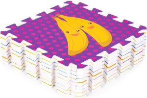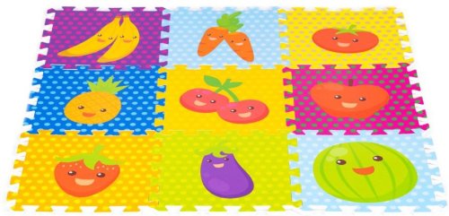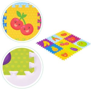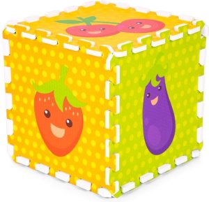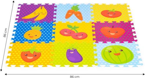 Pěnové puzzle s motivem ovoce pro děti od 1 roku. Puzzle má vroubkovaný povrch. Bezpečná a měkká podložka je omyvatelná, tlumí hluk a izoluje od chladu, je proto ideální jako hrací koberec nejen do dětských pokojů. Tloušťka pěnového puzzle je 0,9 cm. Velikost jednoho dílu je 28x28 cm (měřeno od zubu po výřez)