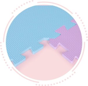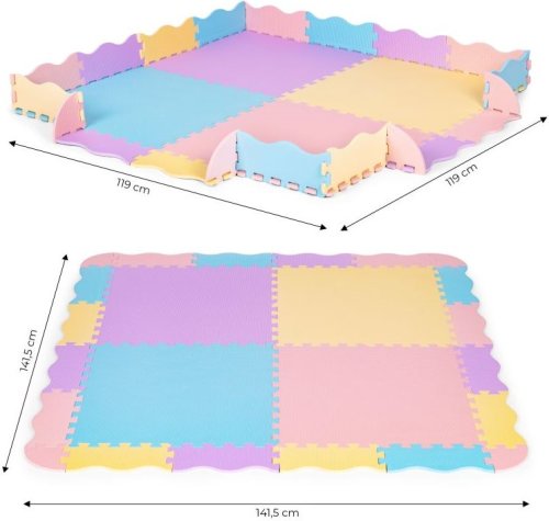 Pěnové puzzle s dílky v krásných pastelových barvách pro děti od 1 roku. Balení obsahuje 4 čtvercové díly, 16 okrajových dílků a 4 rohové dílky. Bezpečná a měkká podložka je omyvatelná, tlumí hluk a izoluje od chladu, je proto ideální jako hrací koberec nejen do dětských pokojů. Tloušťka pěnového puzzle je 1 cm. Velikost jednoho dílu je 58,5x58,5 cm (měřeno od zubu po výřez)