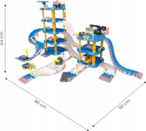 bezpečné pro děti - bez ostrých hran, 2 auta a vrtulník, 4 podlaží v 1. části garáže, 2 podlaží ve 2. části, přistávací plocha pro vrtulníky, vstupní rampy, čerpací stanice, dopravní značky a semafory, stimuluje představivost a rozvíjí motorickou koordinaci, každá úroveň garáže nabízí různé možnosti parkování, rozměry složené garáže: 90 x 50 x 44 cm.