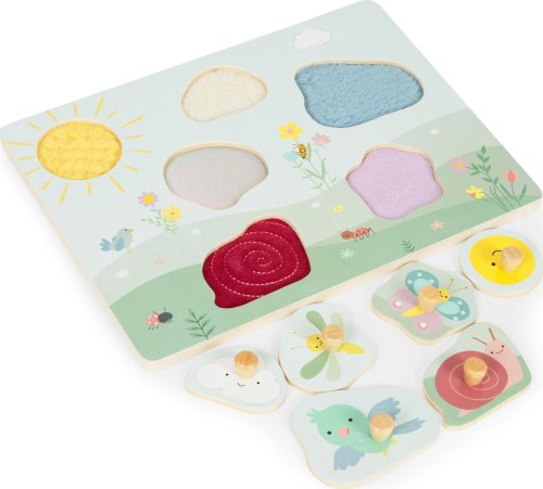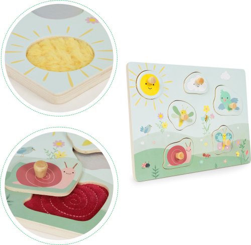 Tato senzorická vkládačka je navržena tak, aby děti prozkoumávaly různé textury, barvy a tvary. Dítě se snaží najít správný obrázek a umístit jej do vyhovujícího otvoru. Jednotlivé vkládací dílky mohou sloužit i jako hrací figurky, kterým mohou děti vymýšlet vlastní příběhy.