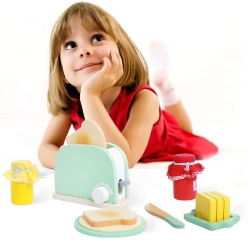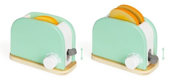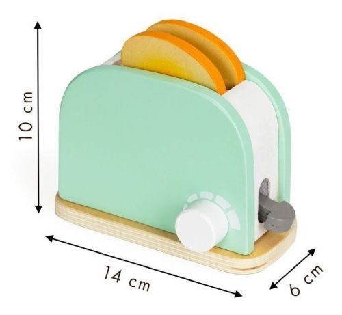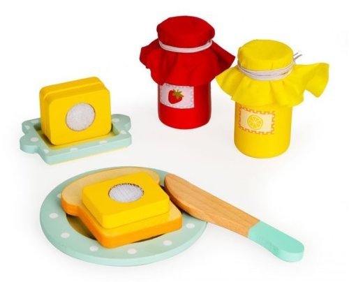 Dřevěný topinkovač má speciální tlačítko, které po jeho stisknutí zasune toust do topinkovače. Vedle tlačítka se nachází také otočný knoflík, který vám umožní nastavit teplotu tak, aby byl toust dokonale propečený. Součástí balení je také nůž, máslo, které lze krájet, talíř a 2 druhy marmelády.