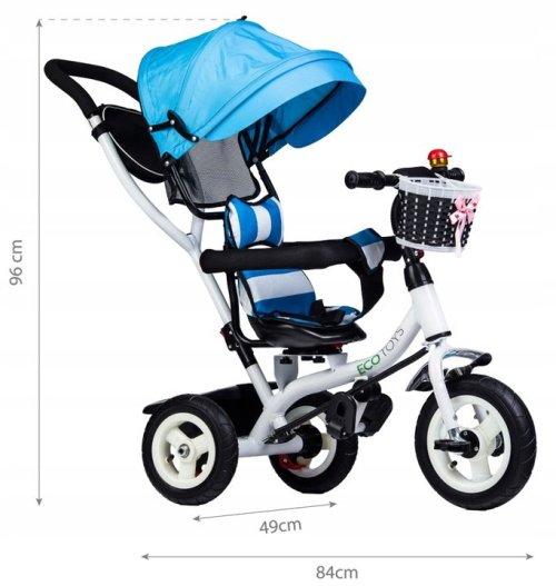 délka tříkolky 84 cm výška vodící tyče 96 cm rozteč zadních kol 49 cm přední kola 12'' (cca 30 cm) zadní kola 9,5'' (cca 24 cm)