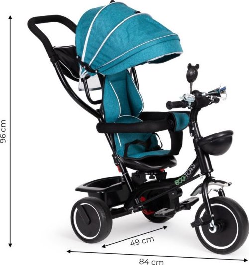délka tříkolky: 84 cm výška vodící tyče: 96 cm rozteč zadních kol: 49 cm průměr předního kola: cca 30 cm průměr zadních kol: cca 24 cm nosnost: 25 kg