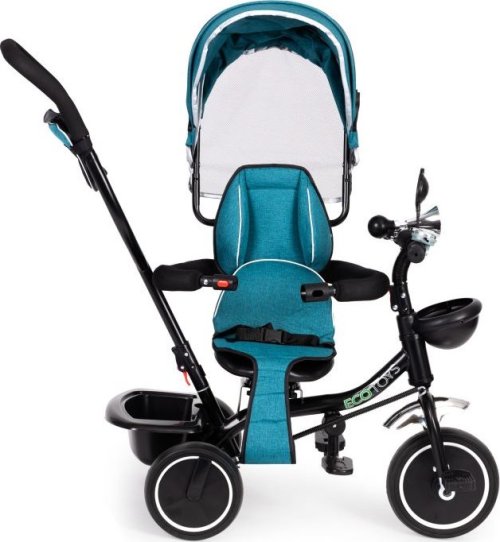 otočné sedadlo o 360° uzamknutí řídítek bezpečnostní brzda sklápěcí stříška a stupátka na nohy měkké polstrované sedadlo bezpečnostní pásy košík na řídítkách a na vodící tyči masivní, vyztužená konstrukce odolné pneumatiky