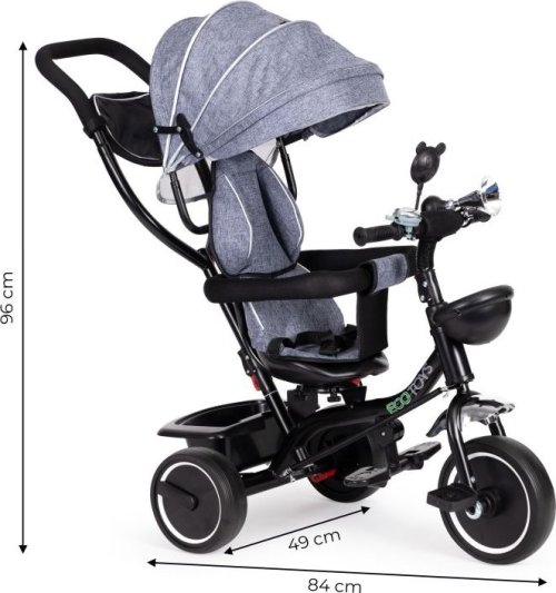 délka tříkolky: 84 cm výška vodící tyče: 96 cm rozteč zadních kol: 49 cm průměr předního kola: cca 30 cm průměr zadních kol: cca 24 cm nosnost: 25 kg