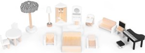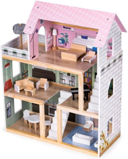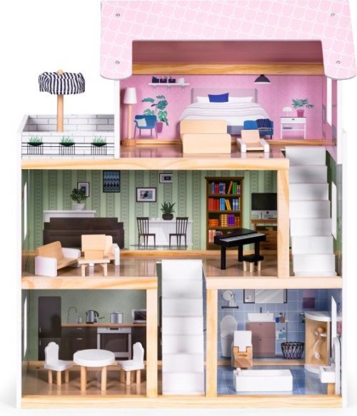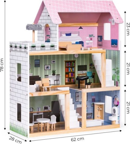 Rozměry domečku: 78 x 62 x 28 cm Dřevěná, bezpečná konstrukce 3 patra, 4 různé místnosti v jiném stylu a terasa Součástí je 15 kusů dřevěného nábytku Všechny prvky lze libovolně odstraňovat a přesouvat Rozvíjí představivost, kreativitu a manuální dovednosti